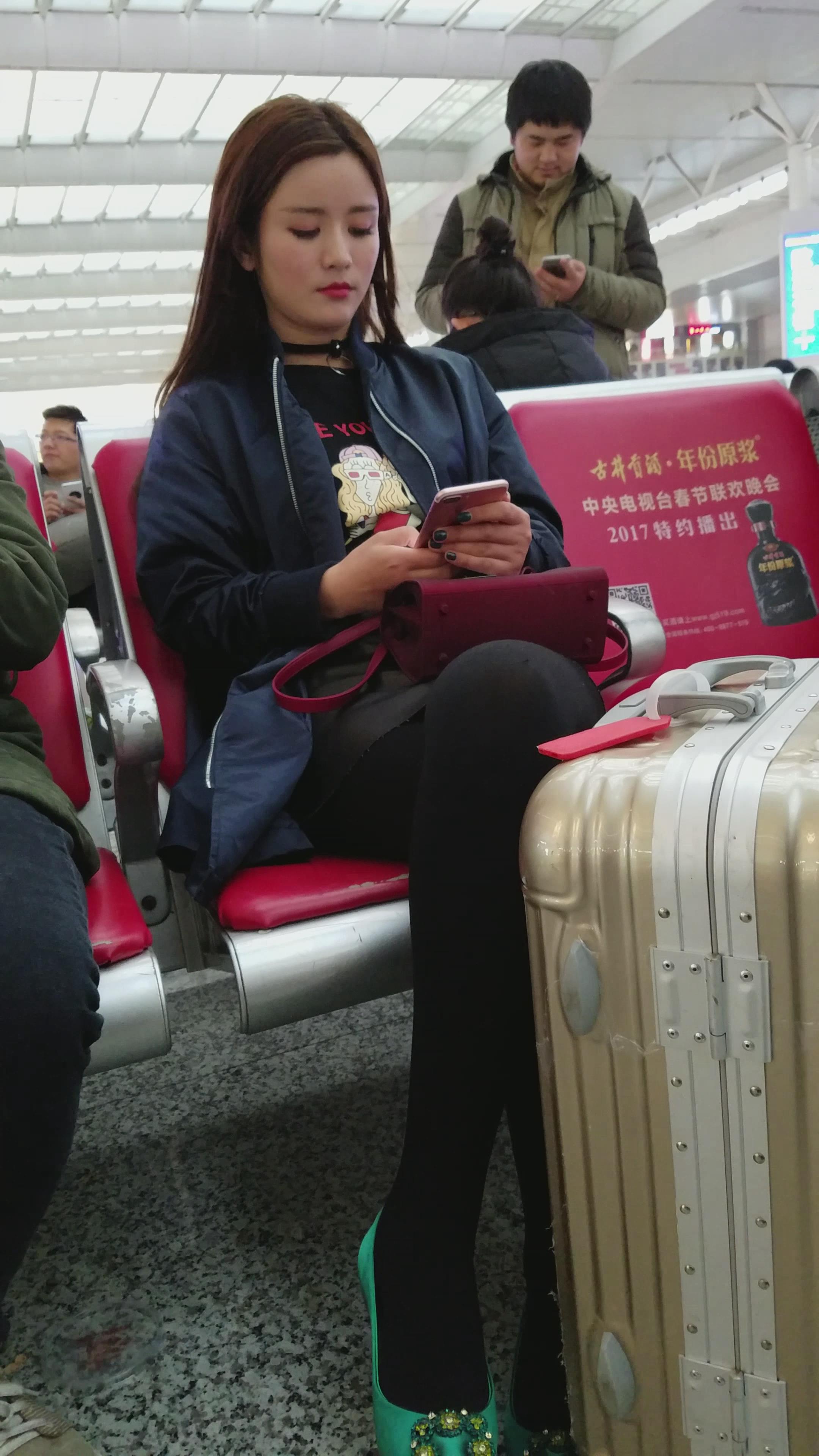 4k-高铁站候车室拍摄大眼睛高冷黑丝袜打底裤女神 编号3034