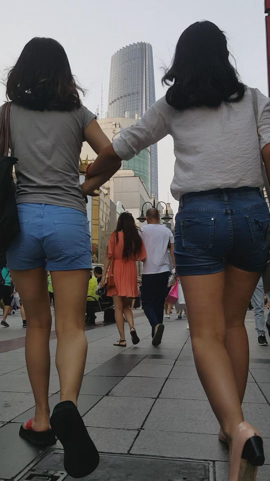 街拍高腰苹果臀热裤姐妹,拉链没拉好开啦 编号4338