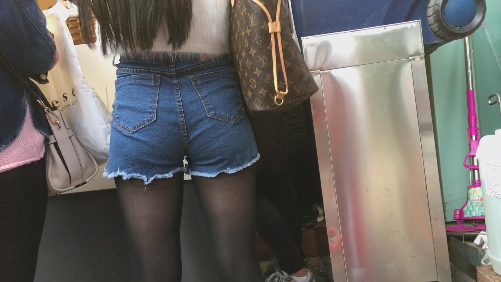 高腰紧身牛仔热裤苹果臀黑丝美眉 编号4348