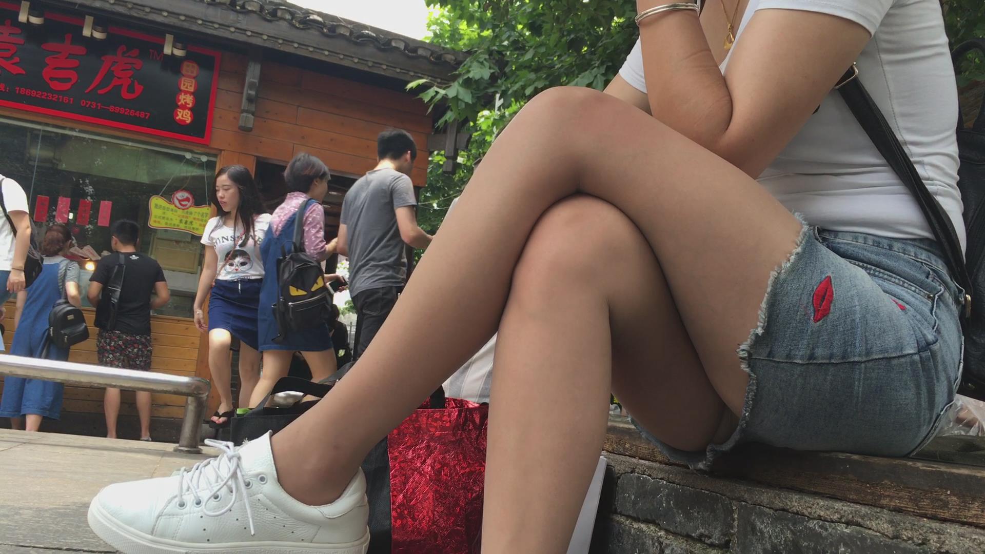 花坛边休息的短热裤白皙美腿女孩 编号4365