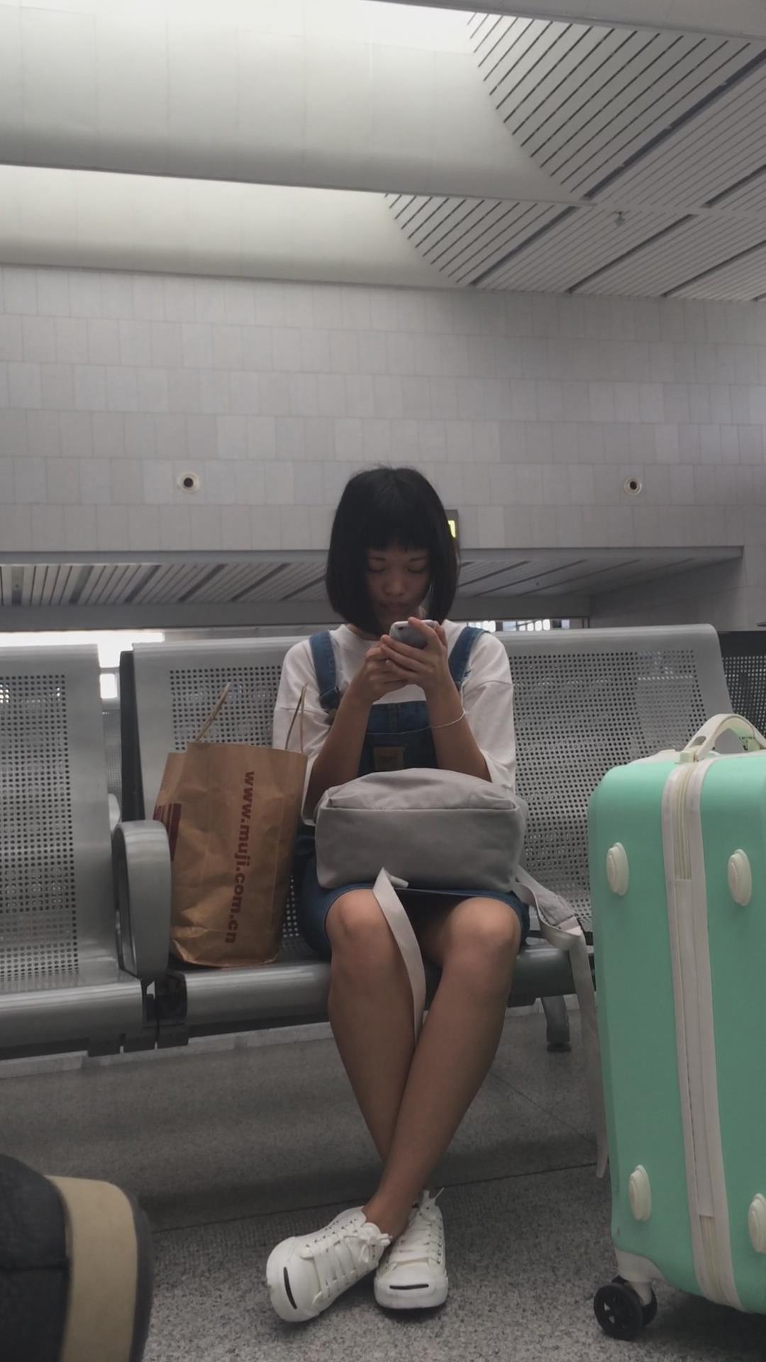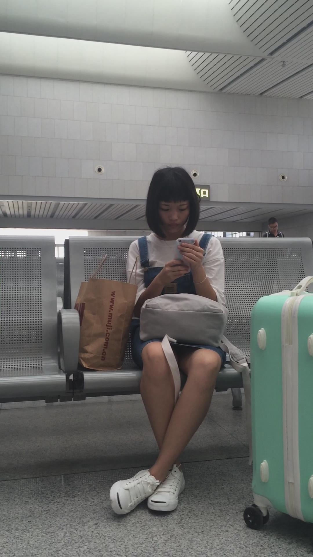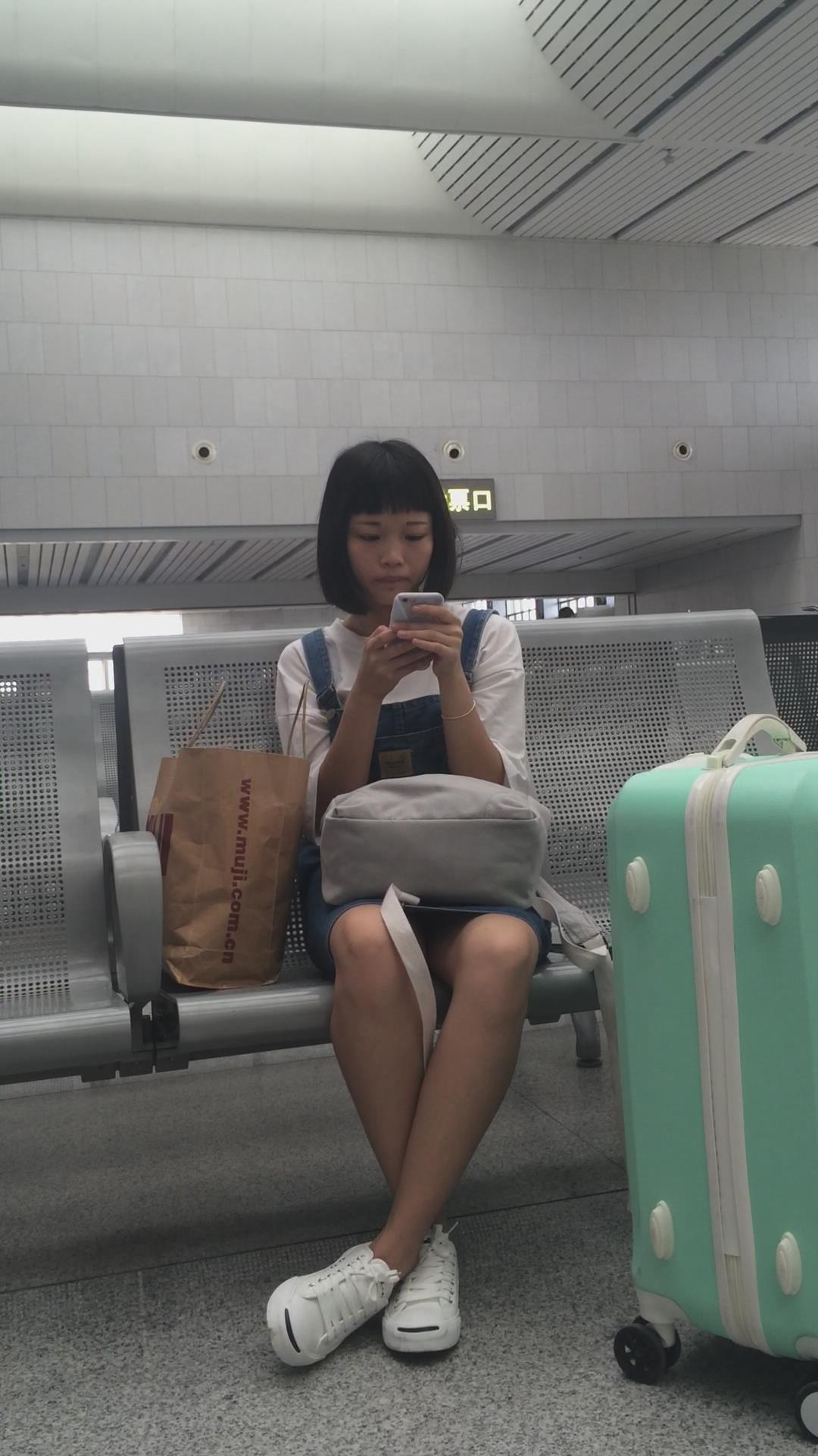 低头玩手机的吊带牛仔裙帆布鞋小清新美女 编号2345