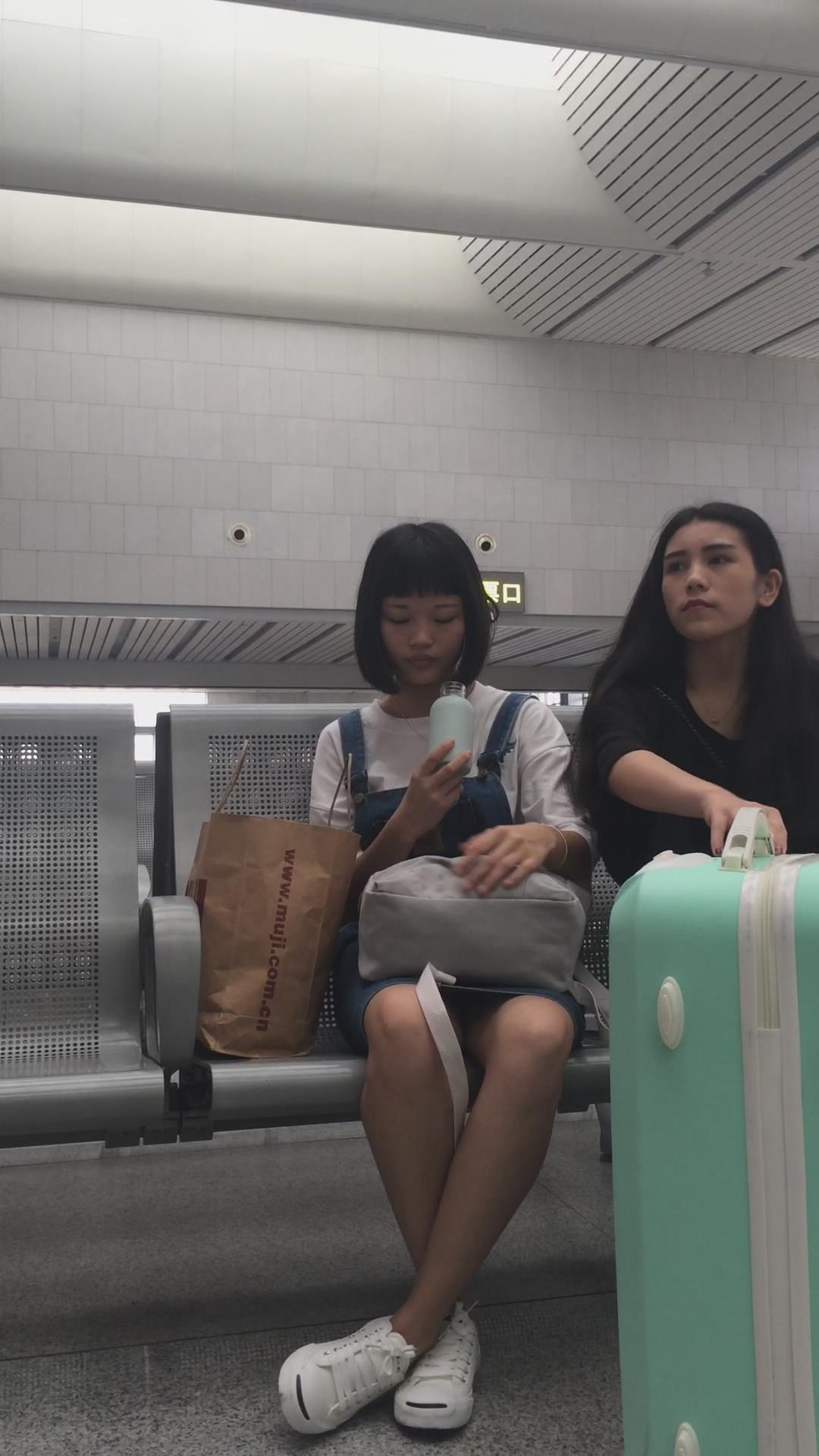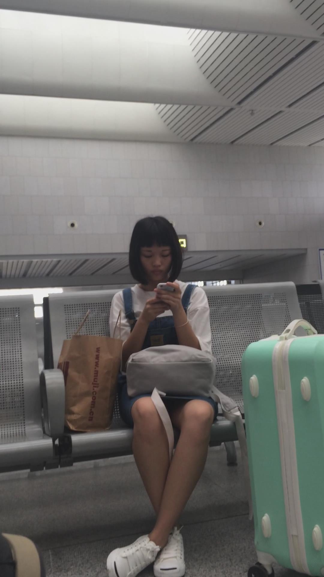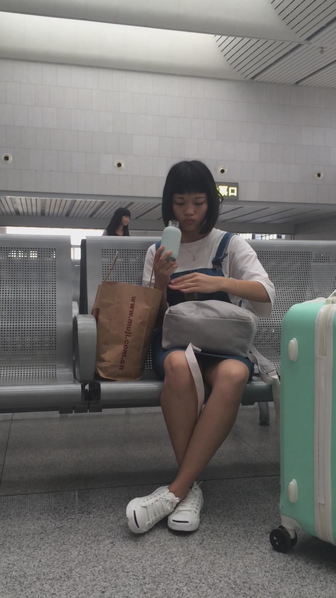低头玩手机的吊带牛仔裙帆布鞋小清新美女 编号2345