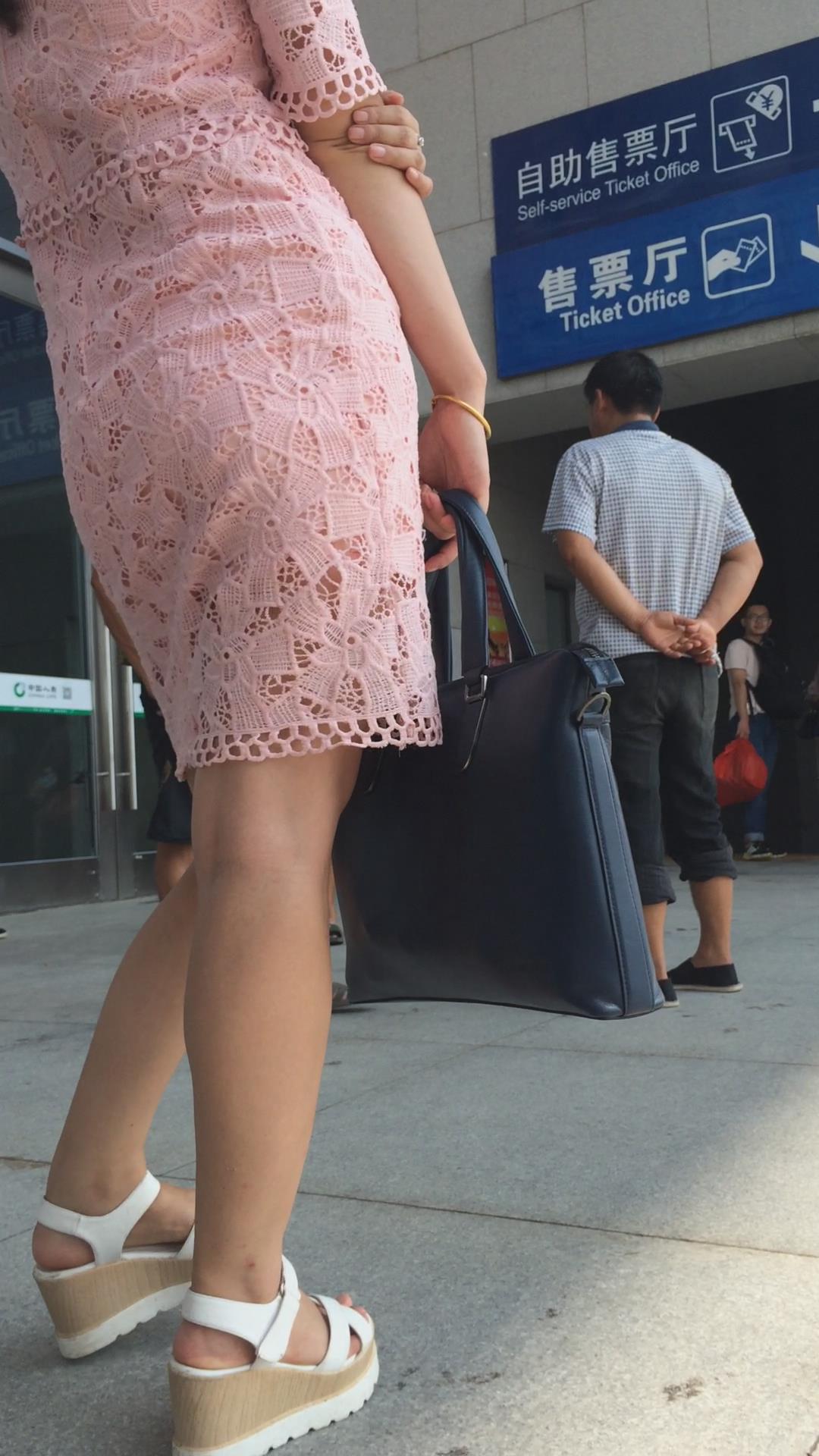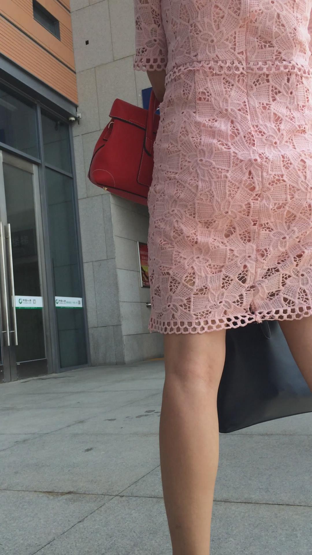 街拍粉色镂空连衣裙光腿美女 编号2418