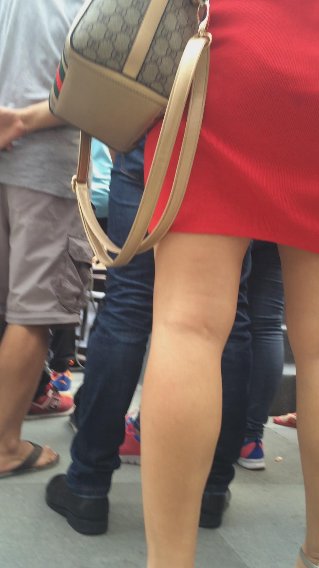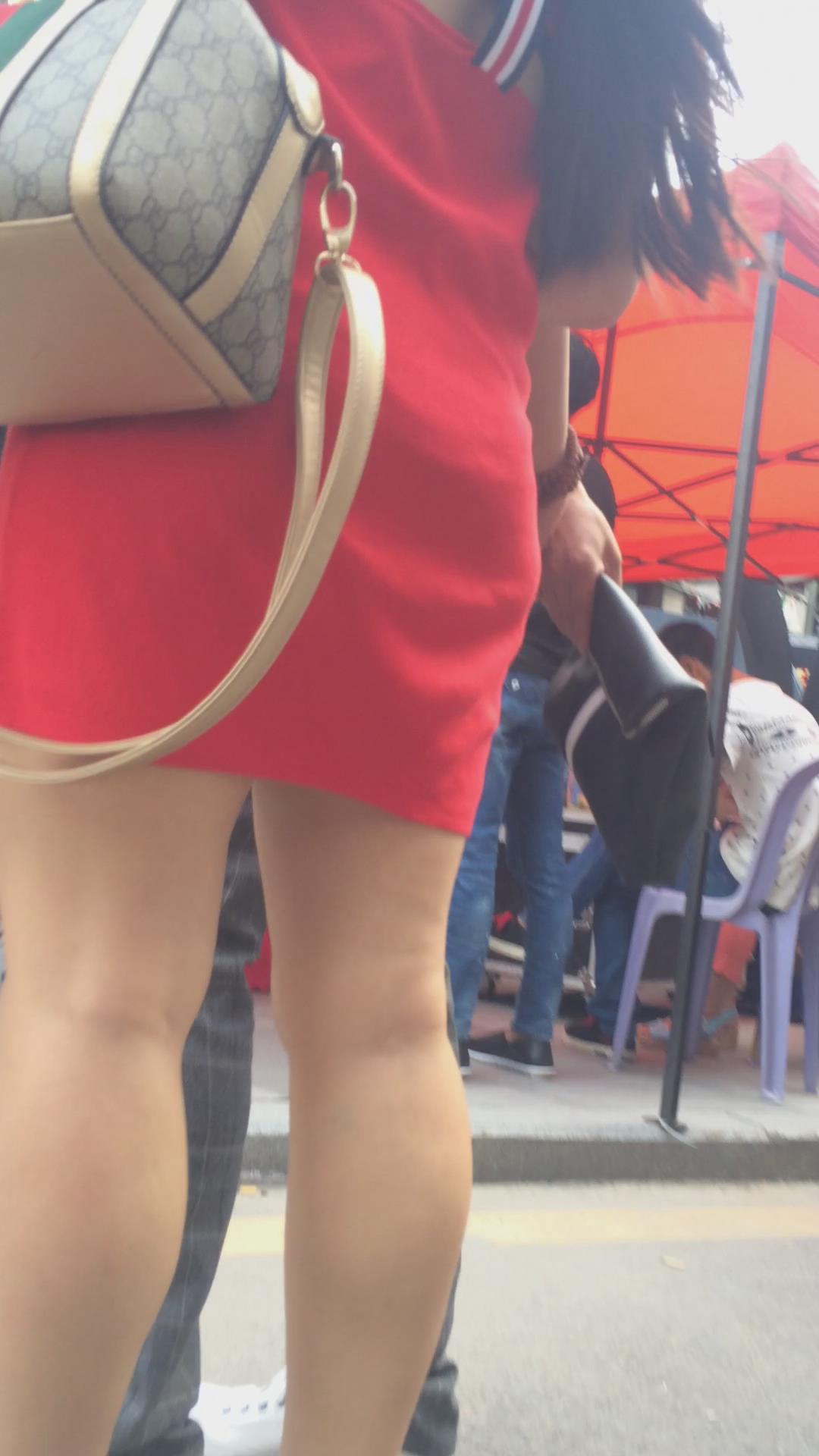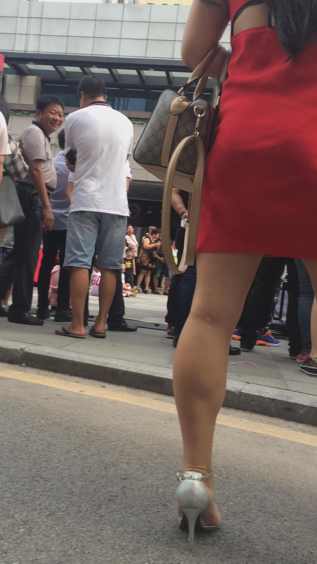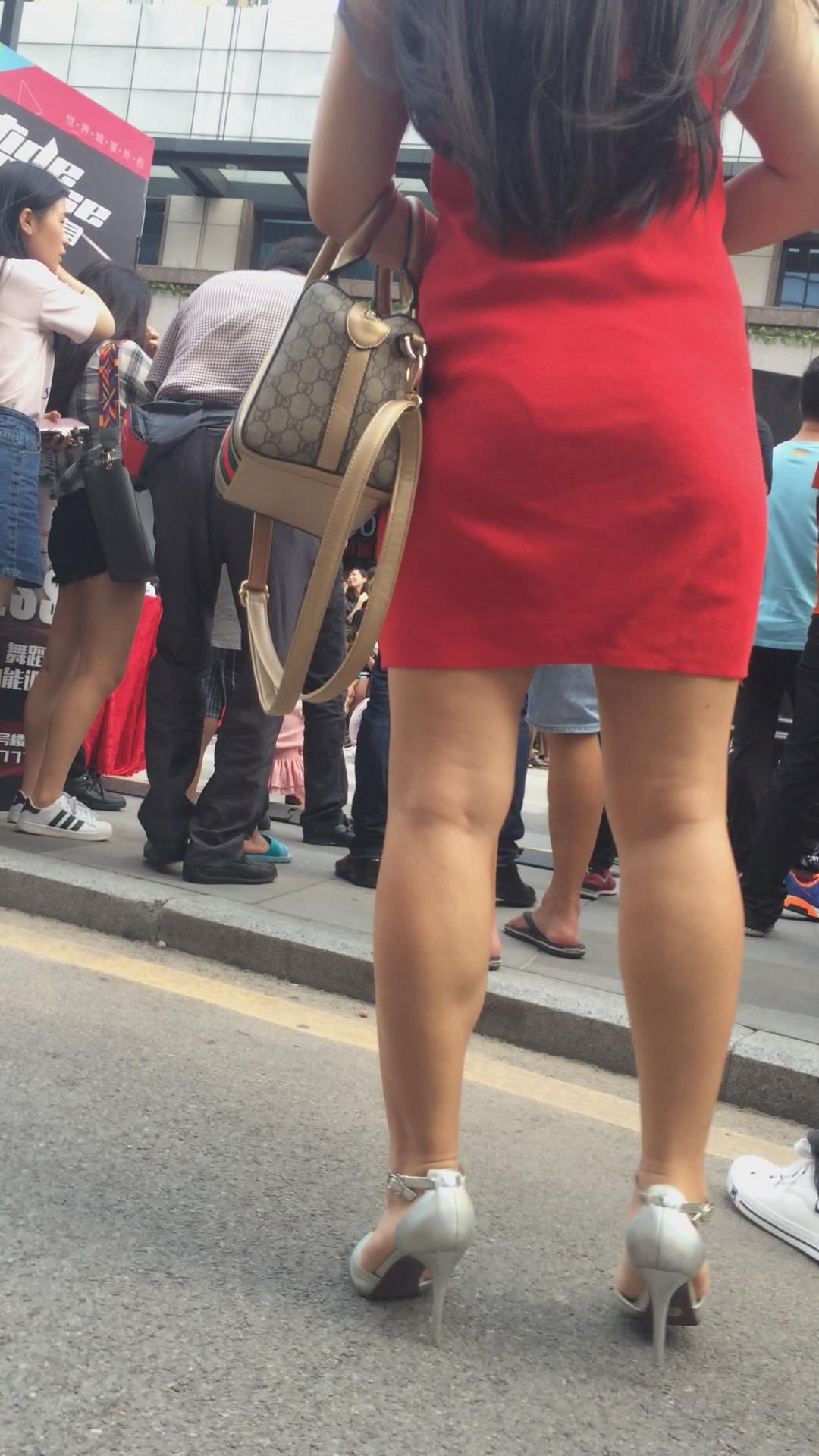 街拍美臀光腿高跟鞋的红色连衣裙少妇 编号2427