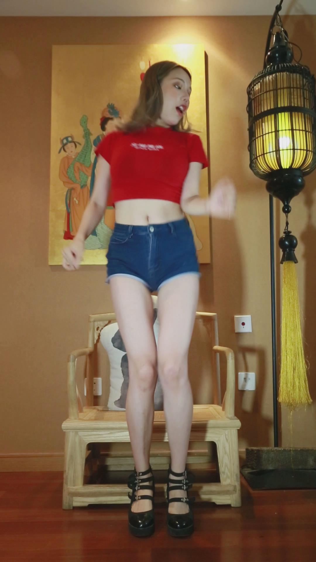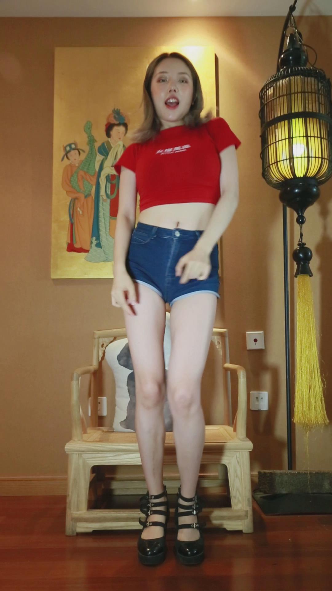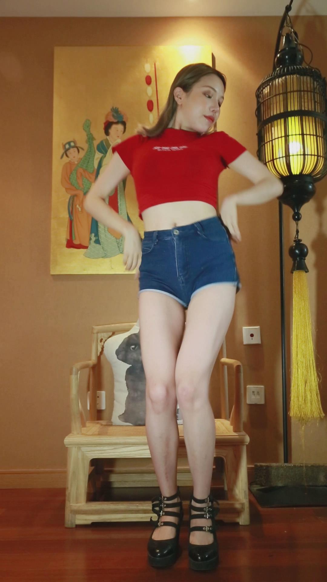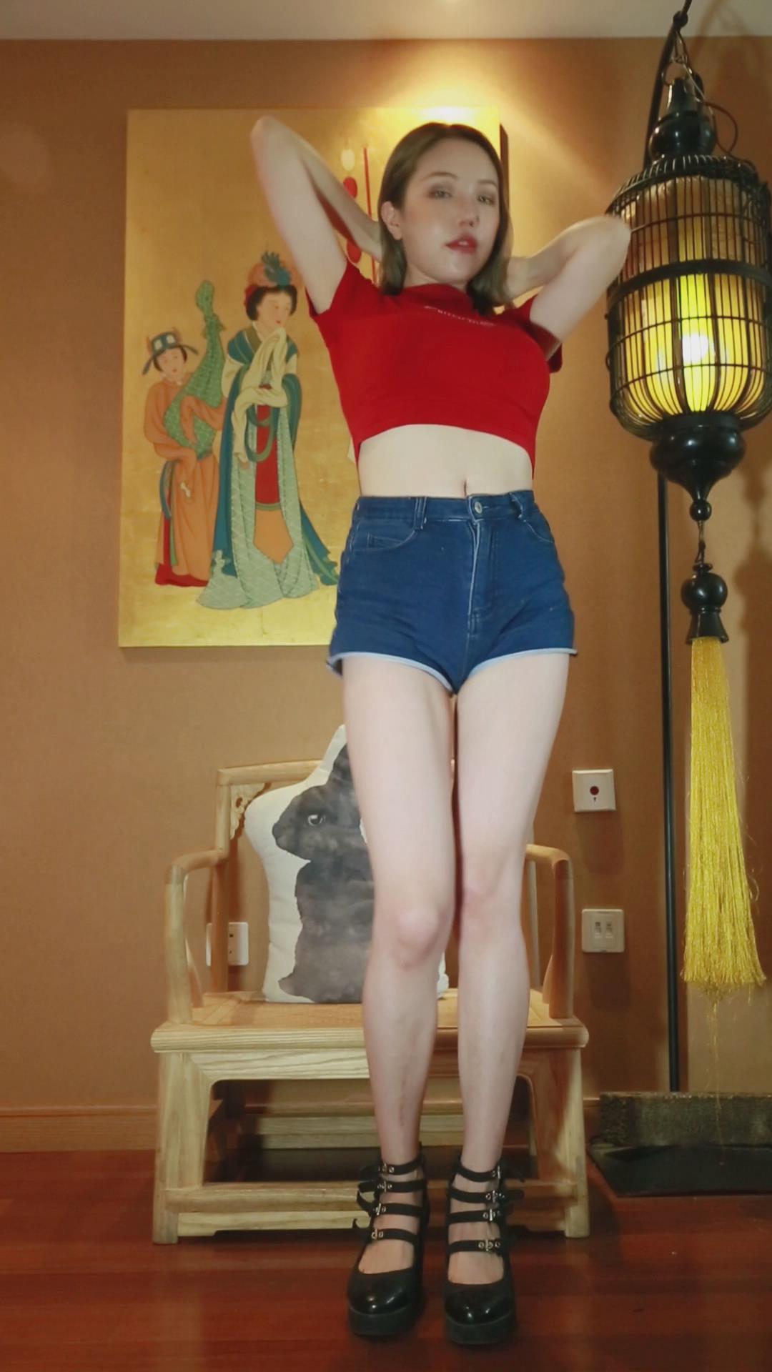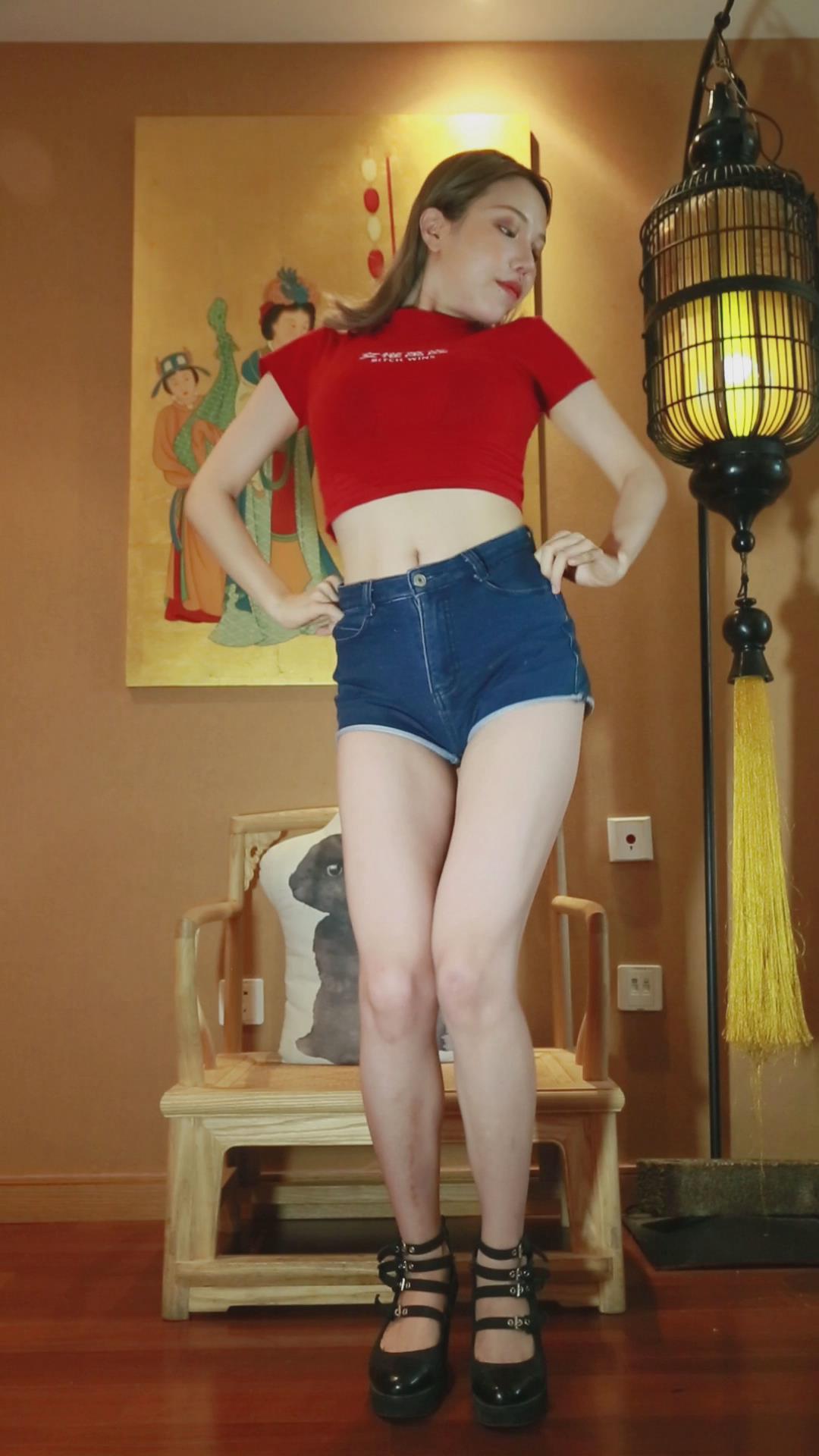 红衣牛仔短裤靓妹正面慢摇 编号6690