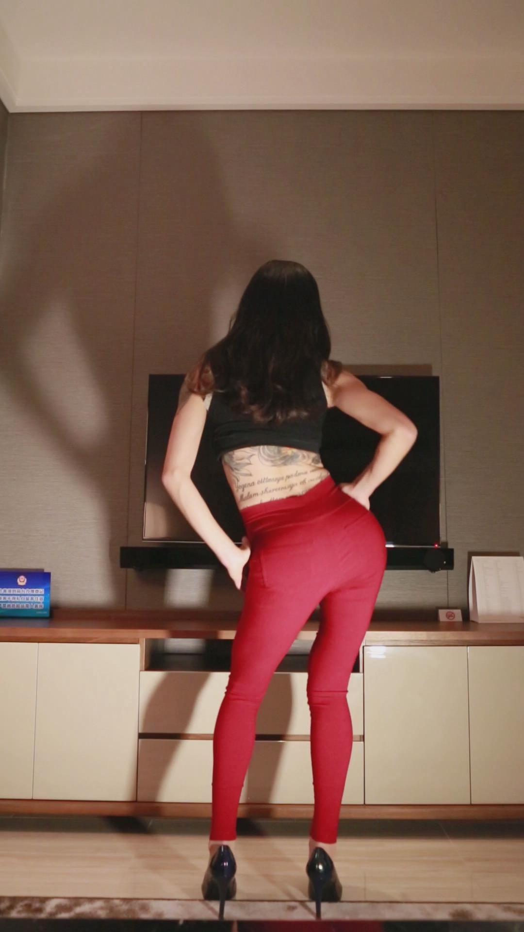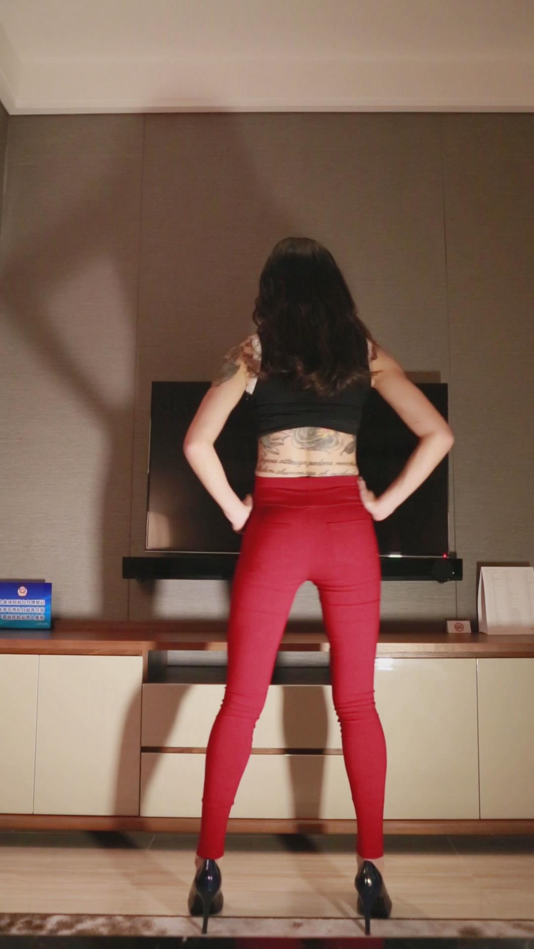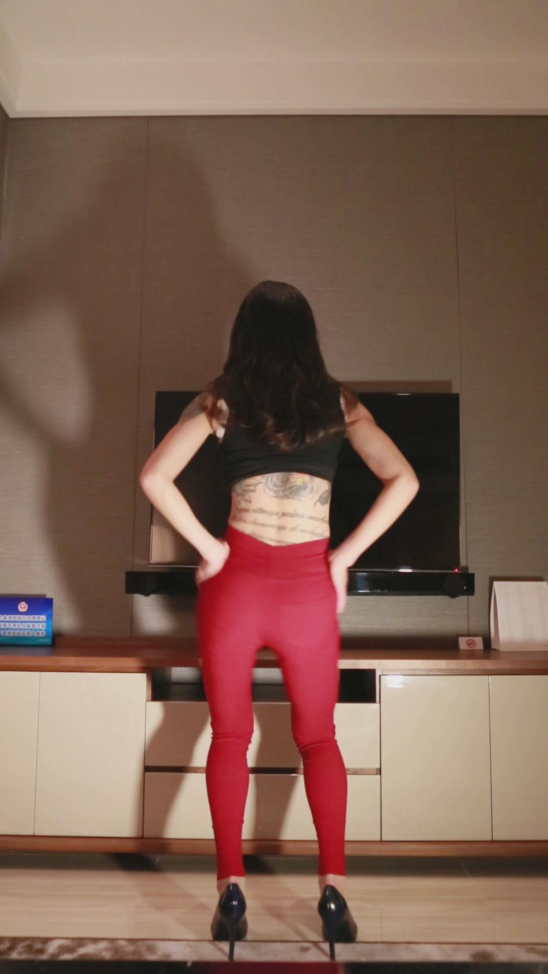 纹身妹红色紧身裤背摇 编号6705