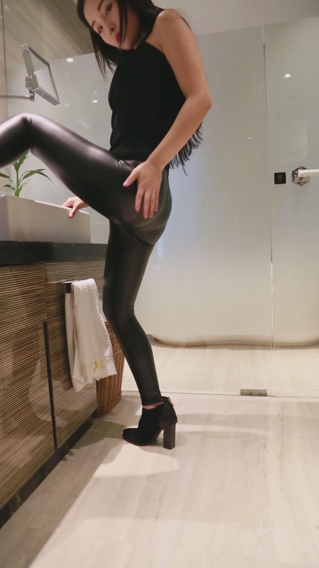 黑色紧身皮裤大长腿美女卫生间 编号6715