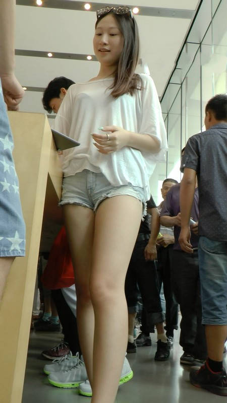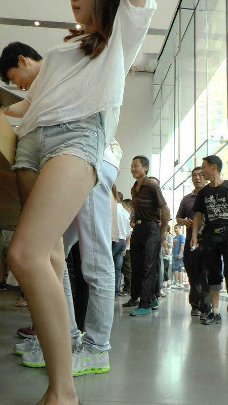 【编号845】街拍苹果店里的完美长腿热裤女神