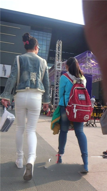 【编号810】街拍紧身白裤女学生和同学逛街