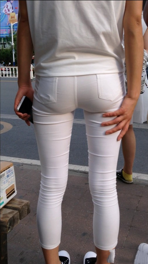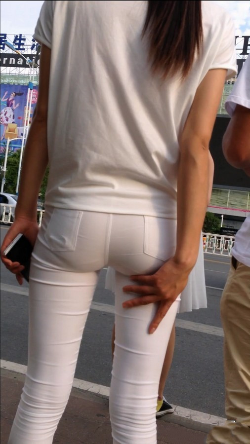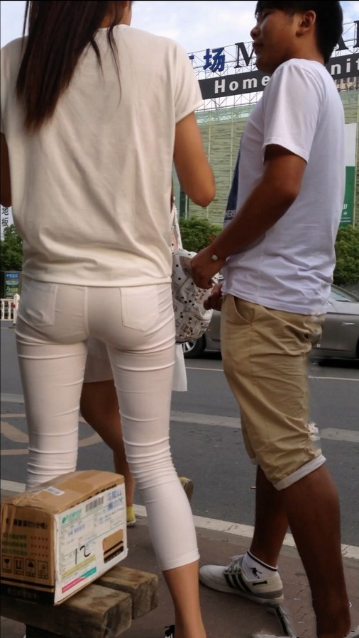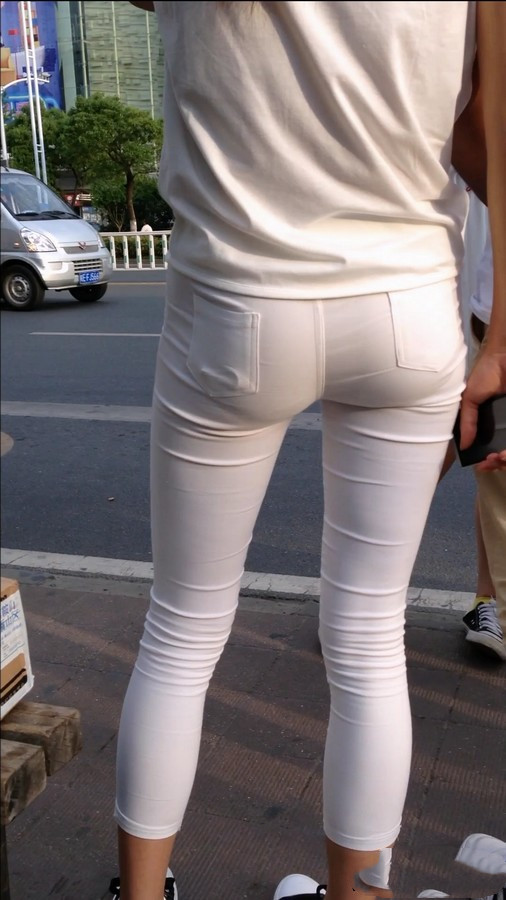 【编号554】极致紧绷!学校门口等公交的白裤女学生