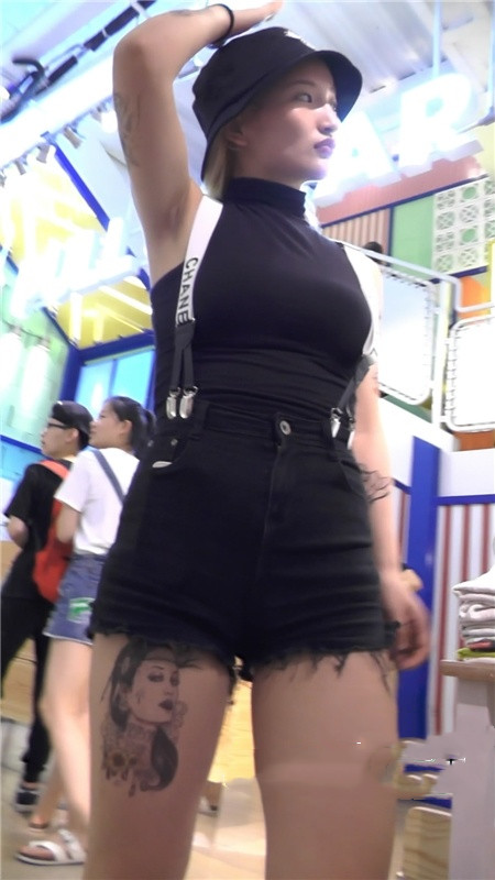 【编号1198】街拍黑色紧身短裤纹身月牙妹子